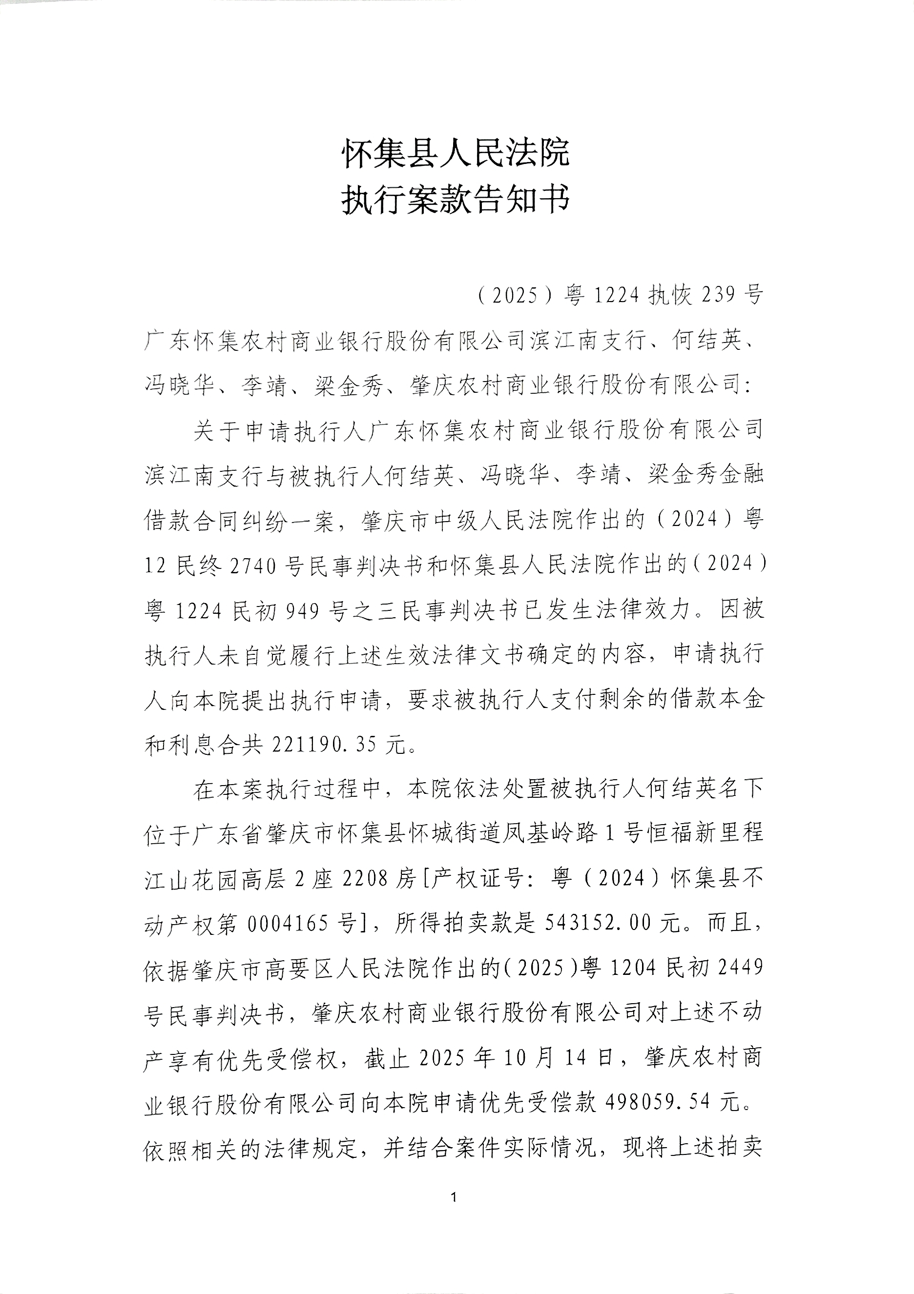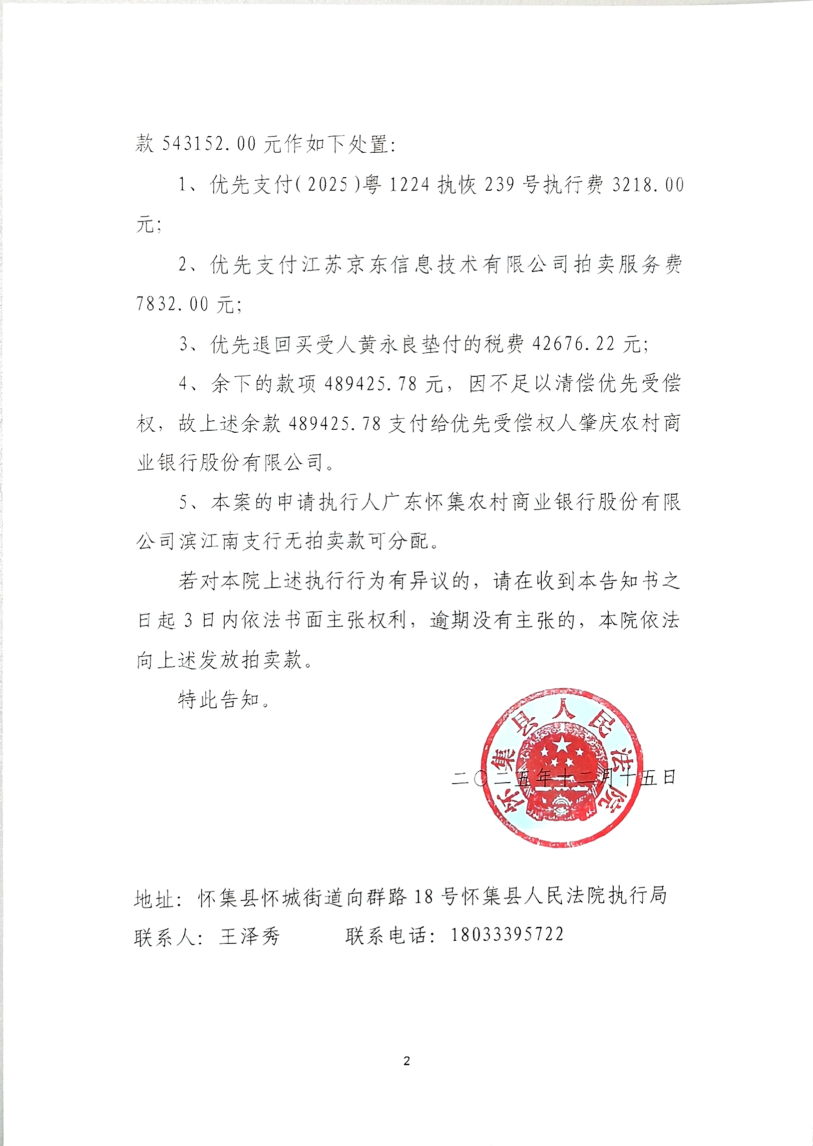 怀集县人民法院执行案款告知书
